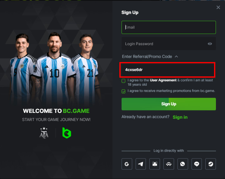 BC.Game extends a captivating welcome bonus for new entrants, notably accessible through the utilization of a promo code. This bonus is effortlessly claimed, with the promo code being automatically applied when you engage via a specific promotional link or through selecting the registration button linked to the offer.