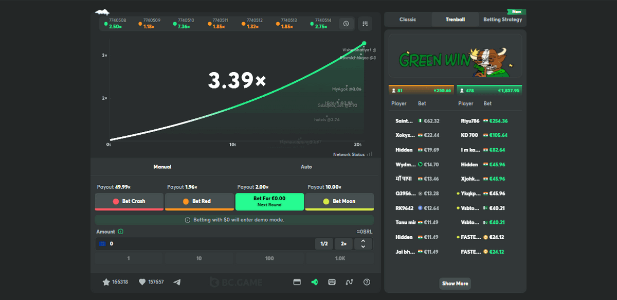 Special FeaturesTrenball mode allows betting on predicted multiplier ranges (Red, Green, Moon)