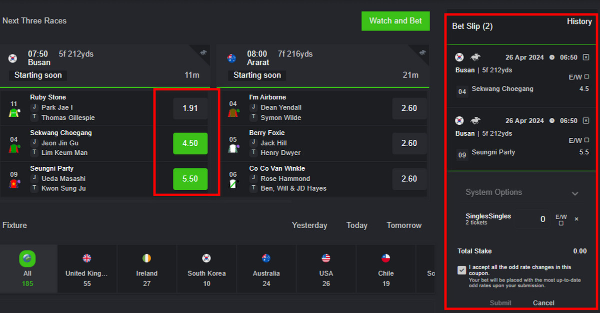 - On landing on the event of preference, one is required to indicate the bet amount in money.